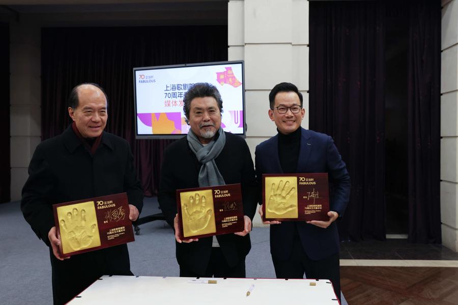發佈會現場,上海歌劇院的三任院長張國勇、魏松、石倚潔(左起)一起留下手印合影留念。