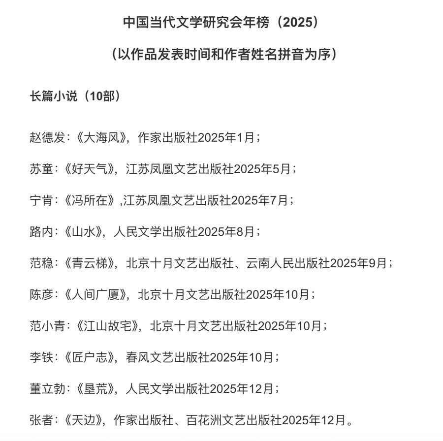 ▷中國當代文學研究會年度榜單(2025)發佈。趙德發《大海風》、蘇童《好天氣》等10部長篇小說入選;劉汀《富貴如雲》、班宇《清水心跳》等10部中篇小說入選;鄧一光《海水快樂地說》、沈念《鏡中》等10部短篇小說入選。此外,還有散文集、詩歌集、非虛構等榜單同期發佈。