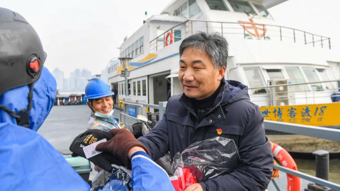 1月5日上午,上海輪渡南陸線陸家浜路渡口暖意融融,工作人員手持嶄新的保暖手套,向過江的乘客遞上冬日裏的特殊禮物。