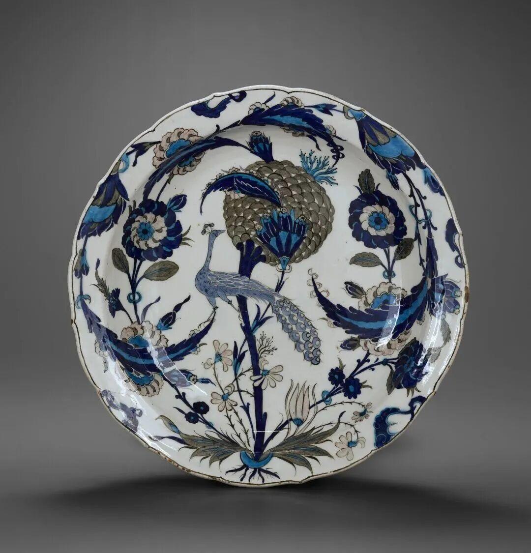 有趣的是,奧斯曼帝國也曾模仿中國青花瓷,如伊茲尼克陶瓷最初大量引用青花元素,但逐漸融入蘇丹紅、綠松石藍等本土色彩,並發展出符合伊斯蘭美學的植物花鳥紋樣體系。這次展覽中看到的瓷碗,鈷藍底色上的留白裝飾,乍一看非常像元青花,只是圖案更具奧斯曼宮廷美學特點;另一件土耳其孔雀紋盤也是典型代表,孔雀元素顯然來自波斯文化,代表王權與威儀。