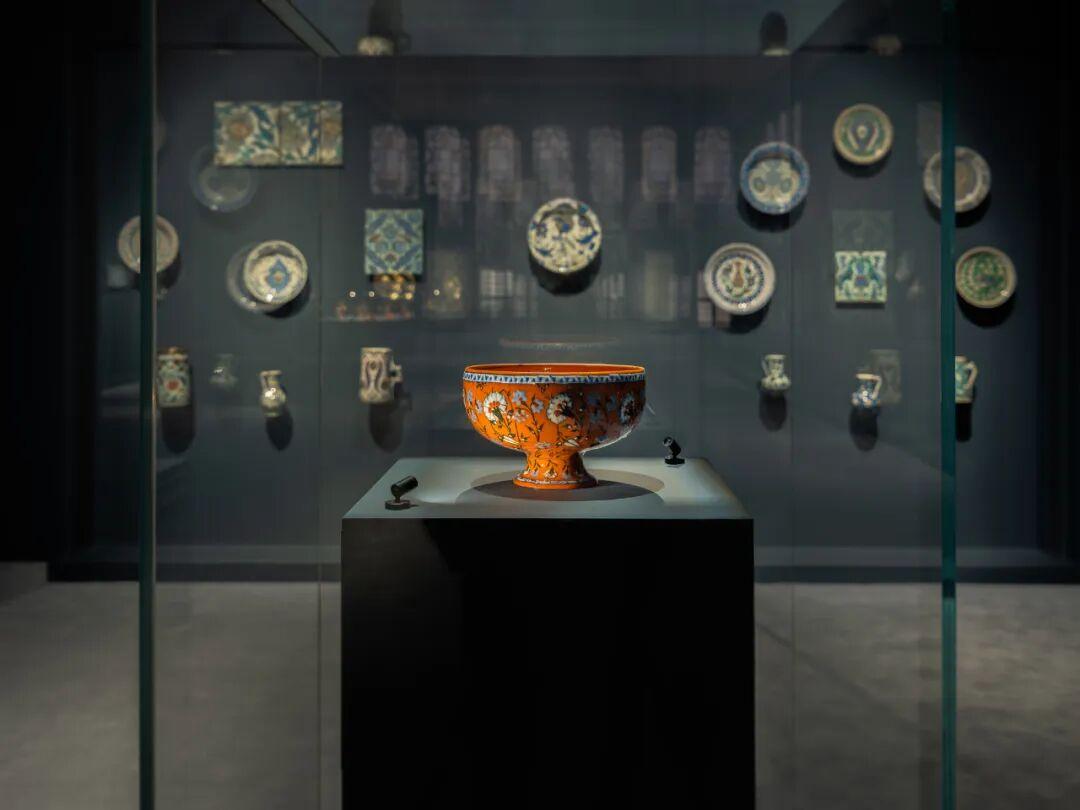 伊茲尼克陶瓷是奧斯曼圖案的巔峯之一,16世紀前後達到頂峯。這些瓷器起初模仿中國青花瓷,但很快發展出本土風格。其最著名的創新是“珊瑚紅”,這種介於紅與橙之間的釉色,質地厚重、略帶浮起,需高溫精控才能燒出。正如帝國威嚴難測,這種紅也非輕易可控。此次展出的器物中有一件釉彩杯,裝飾錯落有致的花卉圖案,底色則是明豔的珊瑚紅,具有典型的奧斯曼藝術風格。盧浮宮所藏伊茲尼克瓷磚圖案中,鬱金香、康乃馨、梅花枝、石榴是常見母題,既象徵春天、生命與繁榮,也構成帝國的視覺特點。