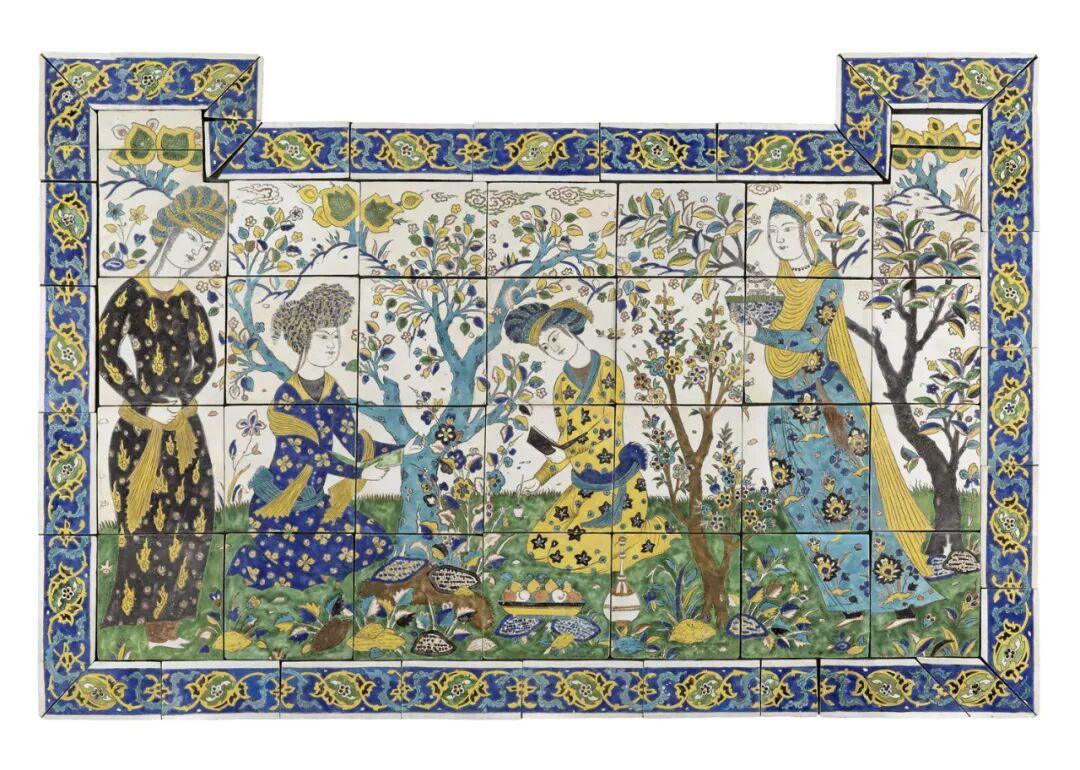 在伊朗薩法維王朝的宮廷中,繪畫、建築與詩歌被視爲三位一體的審美系統。畫師們往往同時是詩人,以極爲精緻的工筆繪製宮廷生活、愛情故事、神話場景,搭配波斯文學詩句。伊朗細密畫中,人物衣袍圖案與背景的地毯紋樣常常構成一個和諧宇宙,幾何與花卉,層疊交融,如夢如幻。如本次展覽中有一件著名的詩會圖釉面陶板,由數十塊拼瓷組成,描繪的是兩位王子在花園中舉辦詩會的場景。這種文藝情境的表達方式,顯示出圖案藝術如何從建築和器物延展爲精神空間。此外,書籍裝幀也體現出這種風格,展品中有一件“夜鶯與玫瑰”圖案的書籍裝飾,借物抒情以傳達詩性的浪漫敘事。