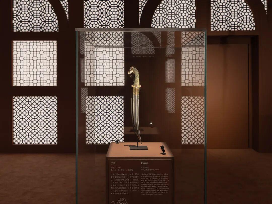印度莫臥兒藝術則是材質與圖案融合的極致。波斯的圖案藝術遇上印度本土對寫實主義與自然的熱情,爆發出前所未有的視覺效果。如展出中一件窗屏,從自然元素中汲取靈感,形成有機與秩序的完美平衡,這是借鑑伊朗自然主義風格的代表作品。同時,莫臥兒皇帝們熱衷蒐集稀世奇寶——祖母綠、紅寶石、玉石、大馬士革鋼,藝術成爲財富的延展。最令人驚歎的是他們對玉石的精雕細琢,甚至將匕首、梳子、鼻菸壺甚至雞蛋大小的石頭都雕刻成可佩戴、可傳世的圖案藝術品。