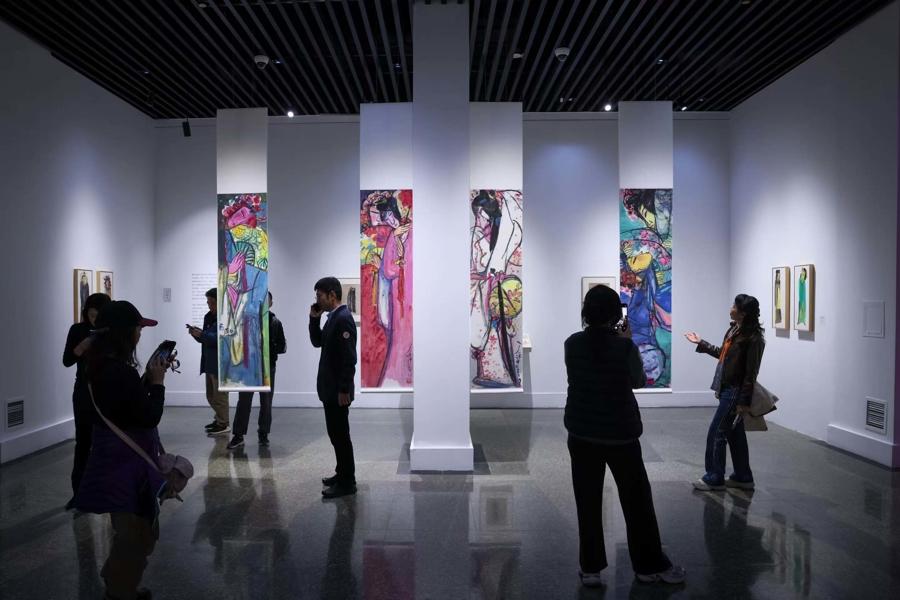 觀衆正在欣賞關良的《水墨人物畫八幅》。 文匯報記者 葉辰亮攝
