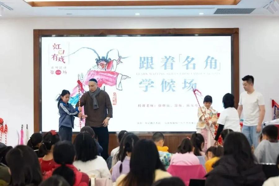 值得一提的是,本次展覽“虹口有戲”系列活動第一場,即由史依弘團隊弘依梅暨梅蘭芳藝術傳播上海基地的三位青年京劇演員“挑大樑”。在這場“跟着名角學候場”工作坊中,他們通過手把手教學,讓孩子們認識了水袖、試了兵器,體驗了京劇唱唸做打和戲劇舞臺裝扮,成爲在場青少年的“京劇啓蒙課”。