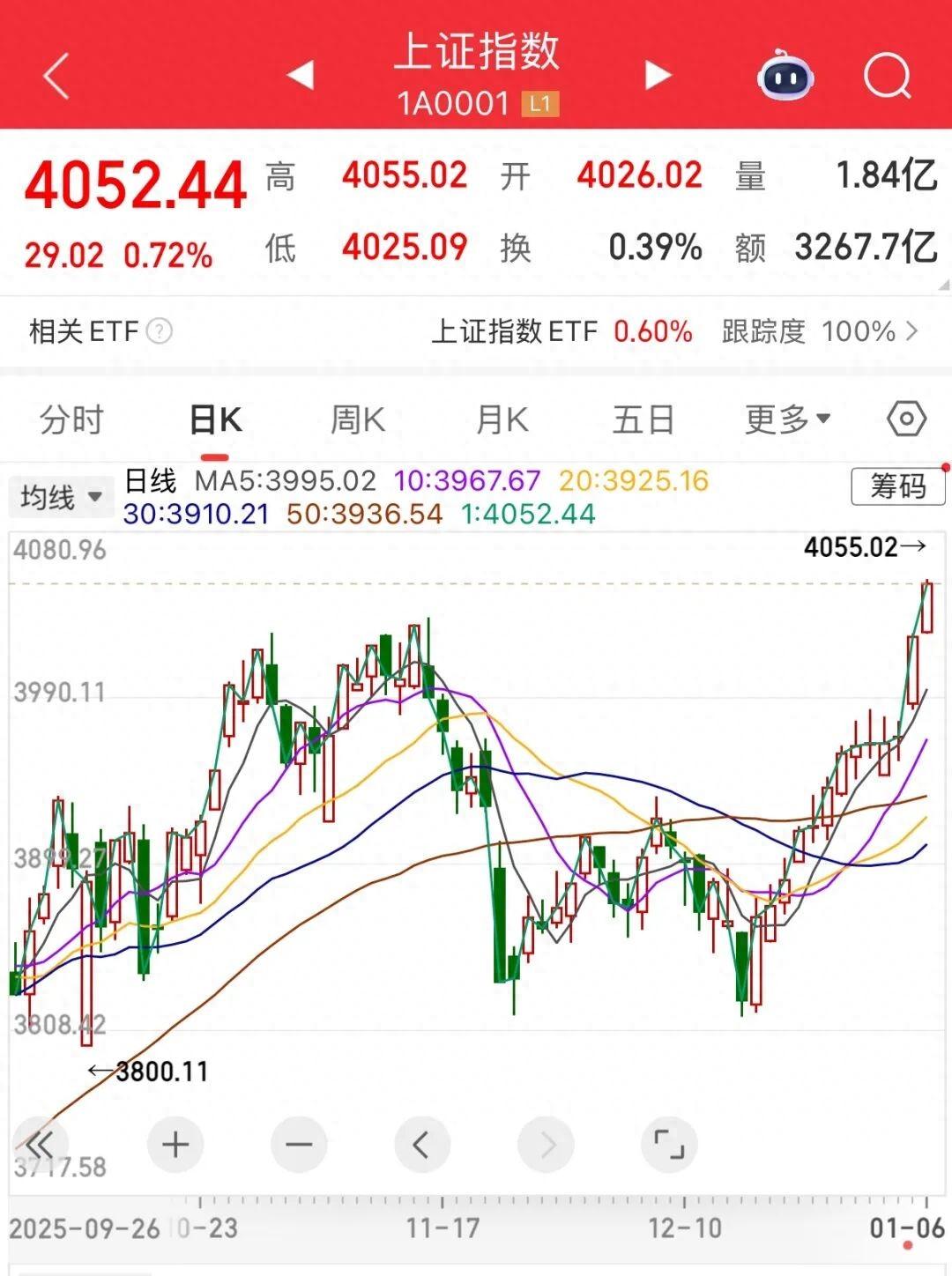 文匯報2026-01-06 10:33:20今日上證指數持續走強,截至發稿前 4052.44, 突破2025年11月14日的階段高點,刷新2015年7月底以來的新高。 來源丨澎湃新聞、上觀新聞編輯丨王秋童