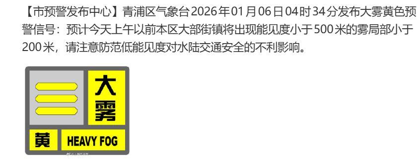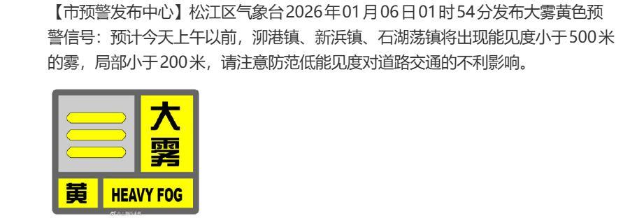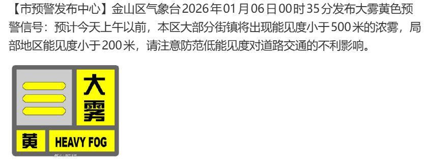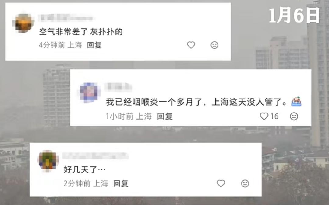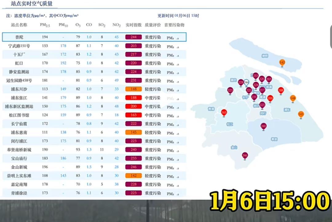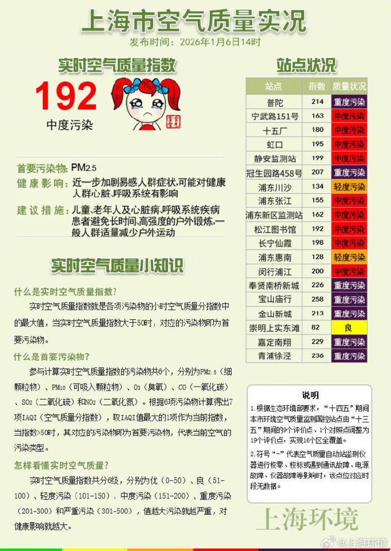 據上海環境,1月6日14時上海市實時空氣質量指數爲192,中度污染,首要污染物爲PM₂.₅,兒童、老年人及心臟病、呼吸系統疾病患者避免長時間、高強度的戶外鍛鍊,一般人羣適量減少戶外運動。