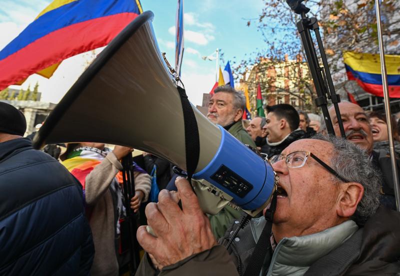 1月4日,民衆在西班牙馬德里市中心的美國駐西班牙大使館前,抗議美國對委內瑞拉採取軍事行動。