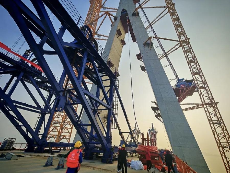 世界最大跨度三塔鋼箱梁斜拉橋首對斜拉索掛設