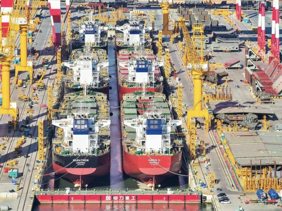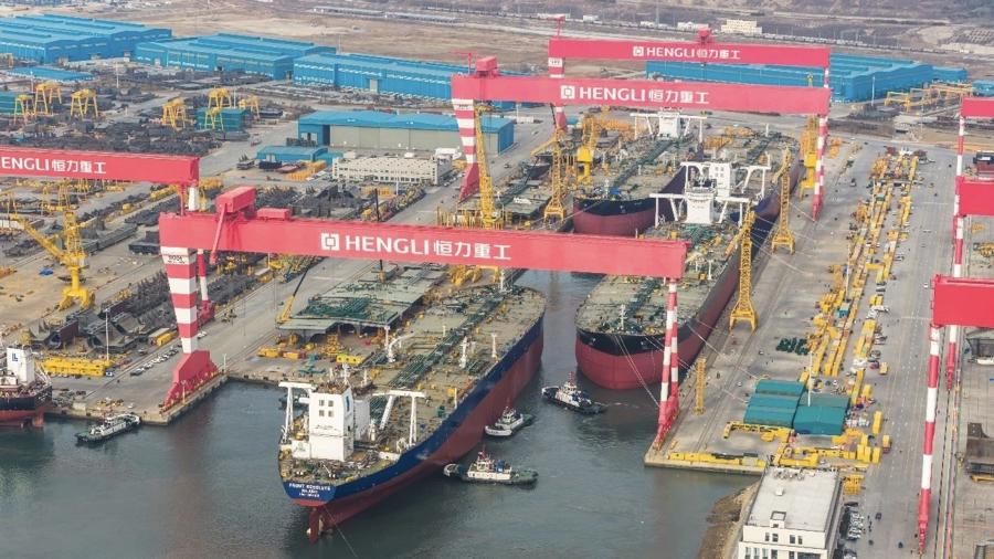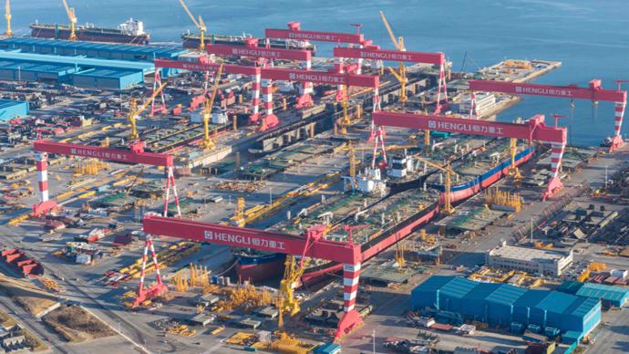 無獨有偶。1月4日,由恆力重工1號船塢建造的4艘30.6萬噸超大型油輪(VLCC)同一天出塢下水。4艘VLCC同塢建造、同日出塢,標誌着恆力重工節拍化、規模化造船能力已達世界領先水平。