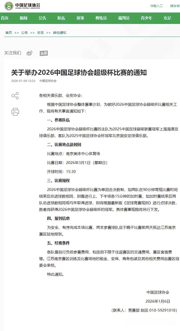 1月6日,中國足協發佈“關於舉辦2026中國足球協會超級盃比賽的通知”,確認賽事將於3月1日15點30分在南京奧體中心體育場開球。