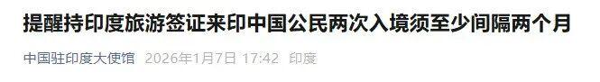 1月7日,據“中國駐印度大使館”官微消息:近日,多名持印度旅遊簽證來印中國公民因兩次入境印度時間間隔未滿2個月,被印方拒絕入境並勸返。根據印方有關規定,持旅遊簽證入境印度,兩次入境之間須至少間隔2個月。印方所發旅遊簽證並未加註該項規定,但如違反,入境時將面臨被退運勸返的風險。