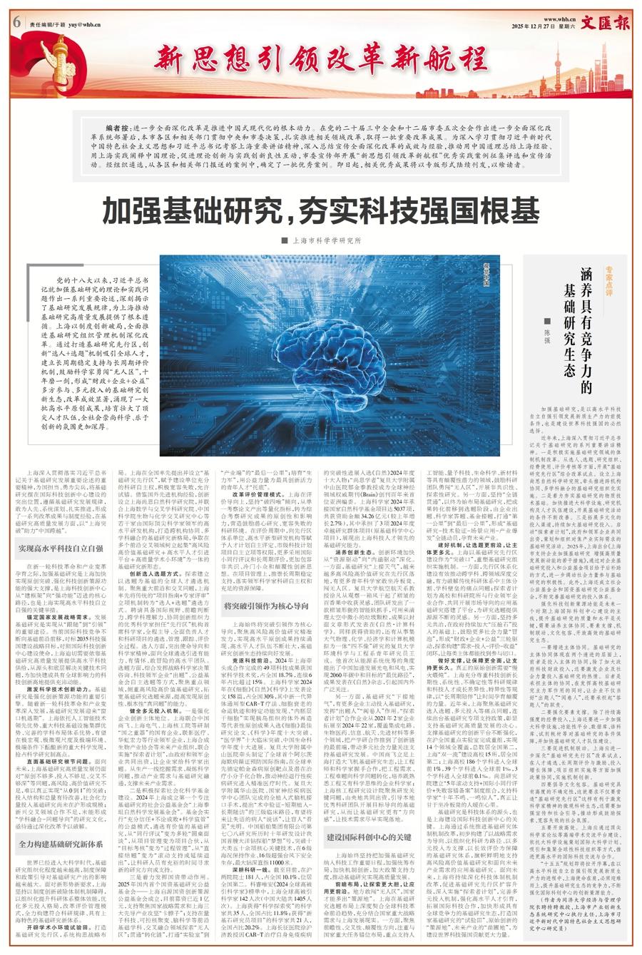 “十五五”規劃即將拉開序幕,在以高水平科技自立自強引領發展新質生產力的進程中,上海使命在肩,必須迎難而上,提升基礎研究生態的競爭力,不斷強化國際科創中心的創新策源能力。