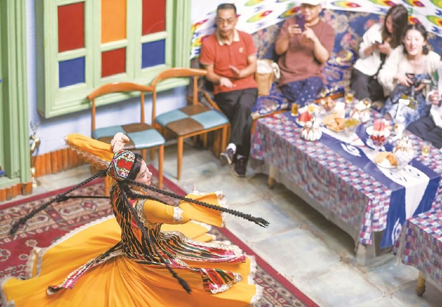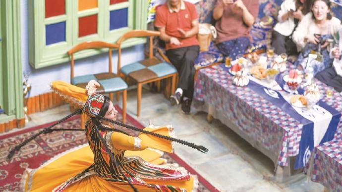 遊客在新疆喀什古城景區“古麗的家”欣賞歌舞表演。新華社圖