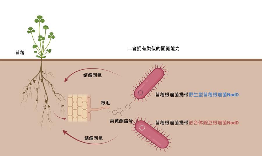 研究團隊進一步比較了苜蓿根瘤菌和豌豆根瘤菌的NodD,儘管兩者相似度高達80%,但它們對類黃酮“鑰匙”響應偏好極爲不同。在他們設計的精巧實驗中,當苜蓿根瘤菌的關鍵“鎖芯”移植給豌豆根瘤菌的NodD後,豌豆根瘤菌NodD也能響應苜蓿根部分泌的類黃酮信號,並展現出與野生型苜蓿根瘤菌相似的結瘤固氮能力。