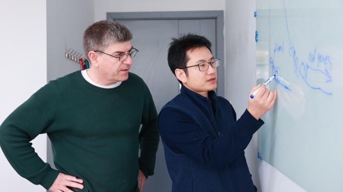 傑睿研究員(左)與張餘研究員(右)在討論工作