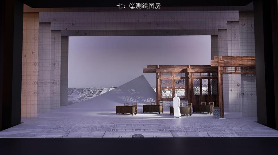 故宮飛檐、天壇穹窿、鼓樓梁檁……北京中軸線所串聯的恢弘古建,如何濃縮於方寸舞臺?這是橫在主創團隊面前的一道難題。方旭坦言:“人與建築的比例關係需要如實呈現,但又不可能把真正的建築搬到舞臺上。”舞美設計王琛想出了辦法:1∶1還原建築局部與關鍵構件——如鴟吻、樑柱、斗拱,並結合繪畫手法與演員表演,將古建的宏大與細節同時呈現。測繪所用的圖紙被放大成舞臺裝置,象徵着青年測繪者的精神與信念。在空間佈局上,通過多媒體投影與繪畫延展空間,遠處的城門、街巷輪廓在光影中逐漸鋪開,虛與實相互疊加,演員在天幕下揮筆勾畫,補全整座北京城,雨燕飛過,觀衆彷彿“走入”彼時的古都。