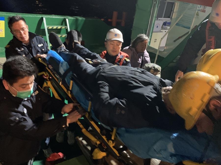 此時,冷空氣席捲江面,寒風凜冽刺骨,溫度一度達到零下4℃,轉運過程中,執法人員克服夜間視線不良、風急浪高和寒冷天氣等不利因素,科學評估轄區實時風浪情況。一方面,與患者及隨行醫生取得聯繫,詳細跟蹤瞭解病患狀況,做好病人防風保暖工作。另一方面,緊急協調轄區船員黨員志願服務隊應急船舶和客運碼頭工作人員,暢通轉運綠色通道,選擇最有利於病患安全登離船泊位,以最快速度完成靠離泊作業,各環節無縫銜接,高效配合,最大程度爲病患爭取寶貴就醫時間。22時43分,在執法人員和轄區船員黨員志願服務隊隊員通力協作下,患者被順利轉移至橫沙通道長興側救護車上,隨後前往上海市區醫院接受進一步治療。