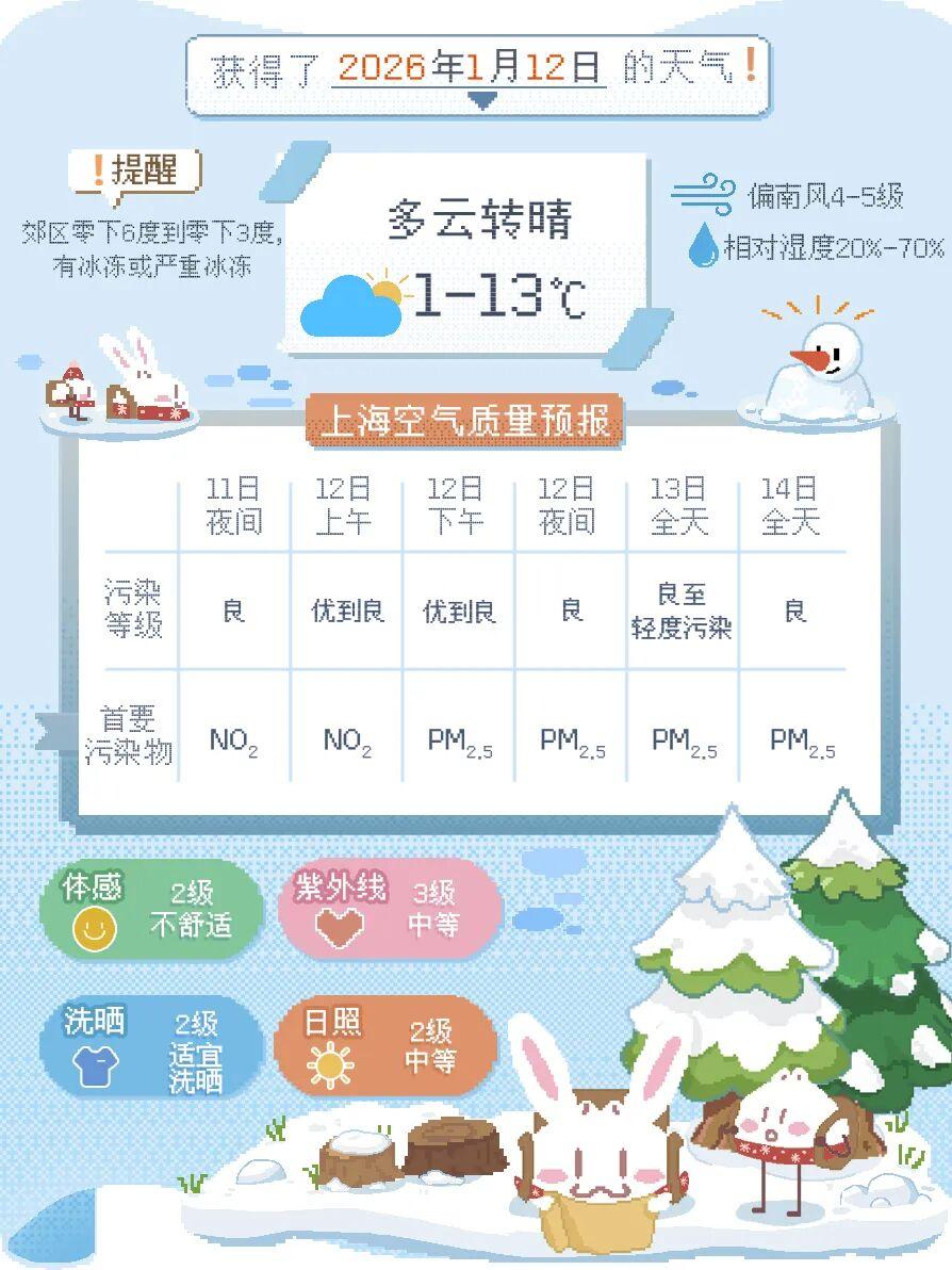 明天早晨上海的氣溫還會繼續下探,預計早間最低氣溫市區在1度左右,郊區在-6度~-3度之間,有冰凍或嚴重冰凍,出行注意添衣保暖。白天雲系較多,以多雲爲主,最高氣溫可回升至13度附近。偏南風4~5級,沿江沿海地區陣風有6級。相對溼度70%~20%。