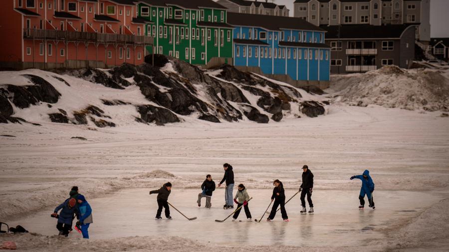 2025年2月16日,在丹麥自治領地格陵蘭島首府努克,孩子們在冰面上玩耍(資料照片)。 新華社發