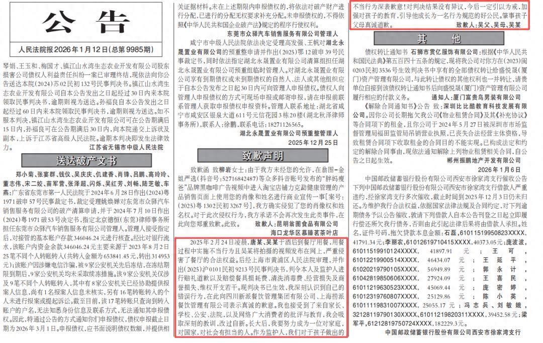 1月12日,“海底撈小便”事件當事人吳某及其父母在《人民法院報》2版發佈《致歉聲明》。