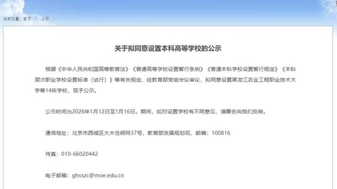 根據《中華人民共和國高等教育法》《普通高等學校設置暫行條例》《普通本科學校設置暫行規定》《本科層次職業學校設置標準(試行)》等有關規定,經教育部黨組會議審議,擬同意設置黑龍江農業工程職業技術大學等14所學校,現予公示。公示時間爲2026年1月12日至1月16日。