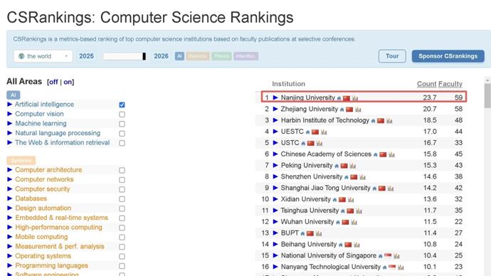 近日,計算機科學領域權威榜單2026 CSRankings正式發佈,在人工智能學科的全球排名中,南京大學以23.7的分數位居全球第一,這一成績不僅刷新了國內高校在該榜單的歷史最佳表現,更標誌着中國人工智能研究實力正式站上世界之巔。