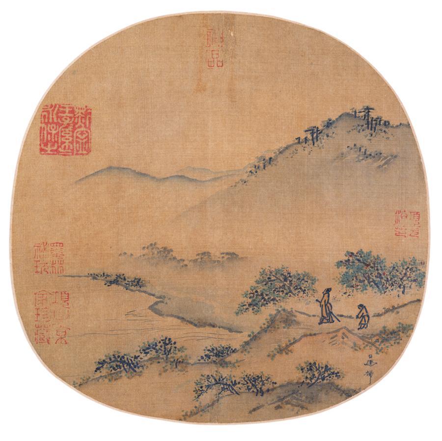 小中見大,一扇一乾坤,是東方美學的千年凝鍊。兩宋是扇面書畫藝術發展的第一個高峯期。上新的展品中,有六件宋代名跡,讓人們直觀感受紈扇書畫藝術的黃金時代。其中,《郊原曳杖圖》扇頁,爲馬麟的精麗之作。此圖以彩墨渲染描繪江南山水,筆簡意賅,技法純熟,經明代沐王府、項元汴鑑藏。