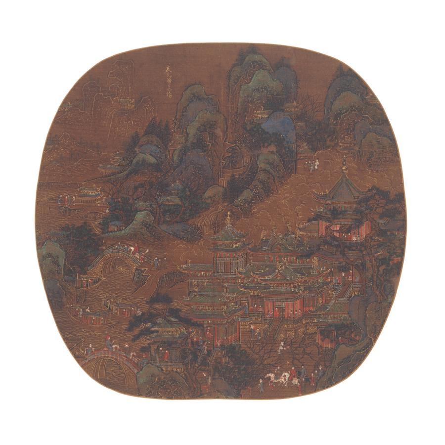 另一佚名《山殿賞春圖》扇頁,畫面佈局繁密,船隻、鞍馬、人物衆多。技法爲金碧山水,以線勾勒山體、建築和水紋,以青綠傅色山石和殿頂,頗具裝飾性。