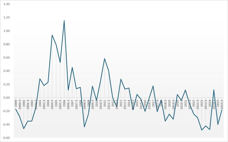 當代藝術景氣指數構建的目的是用來衡量全球當代藝術市場的熱度,覆蓋全球所有當代藝術家過去25年在蘇富比、佳士得和菲利普斯三大拍賣行33000多次交易。當代藝術市場景氣分別在2006春季、2016秋季、和2021春季達到歷史高點,其中2006年左右的好景氣持續時間最長,其中許多拍賣季景氣指數超過0.3,意味着市場競拍非常激烈,作品平均按高於估價30%成交。當代藝術景氣分別在2001秋季、2008秋季、和2025春季達到歷史低點。