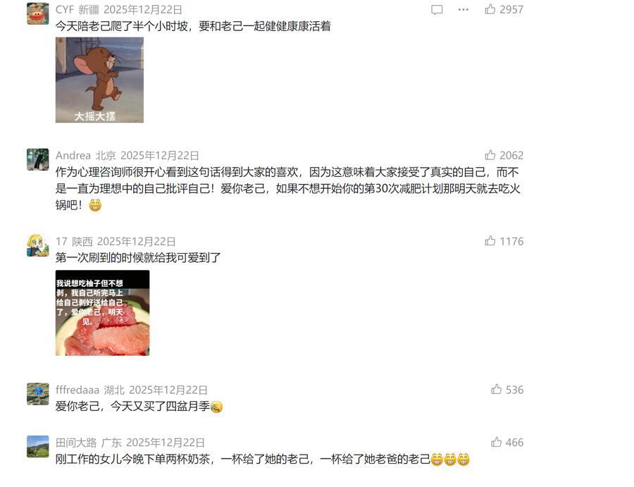 年末“老己”大火,從“第一杯敬自己”到“愛你老己天天見”再到“老來得己”,熱梗的變化足夠證明,從對廣闊世界的關注回收到“自己”,喝杯水、爬個坡、剝個柚子,用小事把自己養好,就是最好的成就。