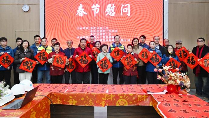 活動現場暖意融融、氛圍熱烈。徐彙區總工會特別邀請的書法愛好者現場揮毫潑墨,根據工人們的心願書寫春聯、福字,一筆一劃間飽含着對建設者的敬意與新春祝福,紅彤彤的春聯和福字讓工人們提前感受到濃濃的年味兒。