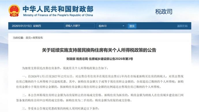 今天,財政部、稅務總局、住房城鄉建設部聯合發佈《關於延續實施支持居民換購住房有關個人所得稅政策的公告》。自2026年1月1日至2027年12月31日,對出售自有住房並在現住房出售後1年內在市場重新購買住房的納稅人,對其出售現住房已繳納的個人所得稅予以退稅優惠。