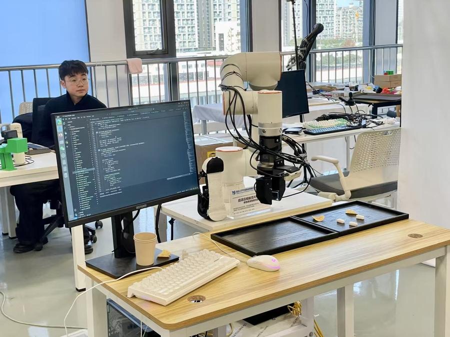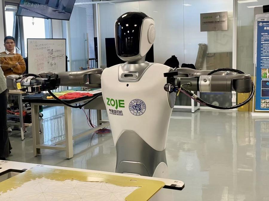 面對布料這種柔軟、易變形的非剛性物體,傳統工業機器人往往束手無策。“這是一塊硬骨頭,既涉及個性化生產,又要對柔性體實施精準操作,過程極其複雜。”齊立哲說。去年4月,復旦與浙江中捷縫紉科技有限公司及玉環市國有資產投資經營集團有限公司,聯合成立“政產學研”一體的工業柔性智能機器人校企聯合實驗室。在這裏,科學家們通過仿生學原理,將老裁縫“捏、拱、滑、夾”的精妙手感和“抓、撐、調、送、檢、縫”的快準協調能力,轉化爲機器人的算法與機械結構,使機器人具備類人的高級技能。“不僅是解決一個企業的技術難題,更是賦能一個區域的產業升級。”齊立哲說。通過與玉環市的合作,實驗室以縫紉機器人爲切入點,撬動當地千億級的傳統制造產業集羣升級。