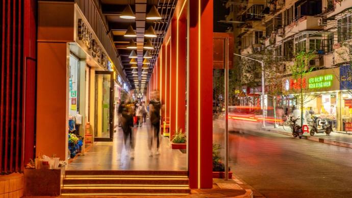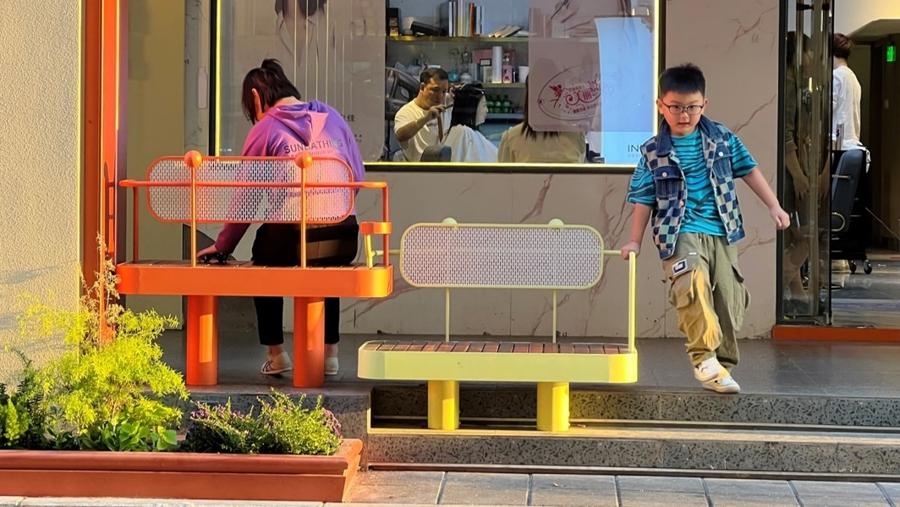 不遠處,黃浦區半淞園路街道的西凌家宅路一派“煙火可親”的景象,居民們坐在五彩繽紛的公共休閒椅上閒話家常,孩子們則在“騎樓”下玩耍,經過精心改造後的街區既有上海老城廂的市井溫情,又有國際化大都市的整潔便利。