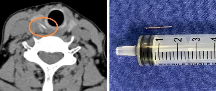 影像結果證實,在劉阿姨右側甲狀腺位置,發現了一條索狀的高密度異物影,極有可能是魚刺穿透食道壁,扎進了甲狀腺。
