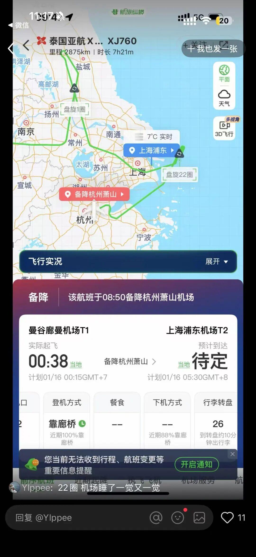 另有網友表示,自己乘坐的航班本來今天早上應該降落浦東機場,但是在上空盤旋了22圈後,最終備降至杭州。