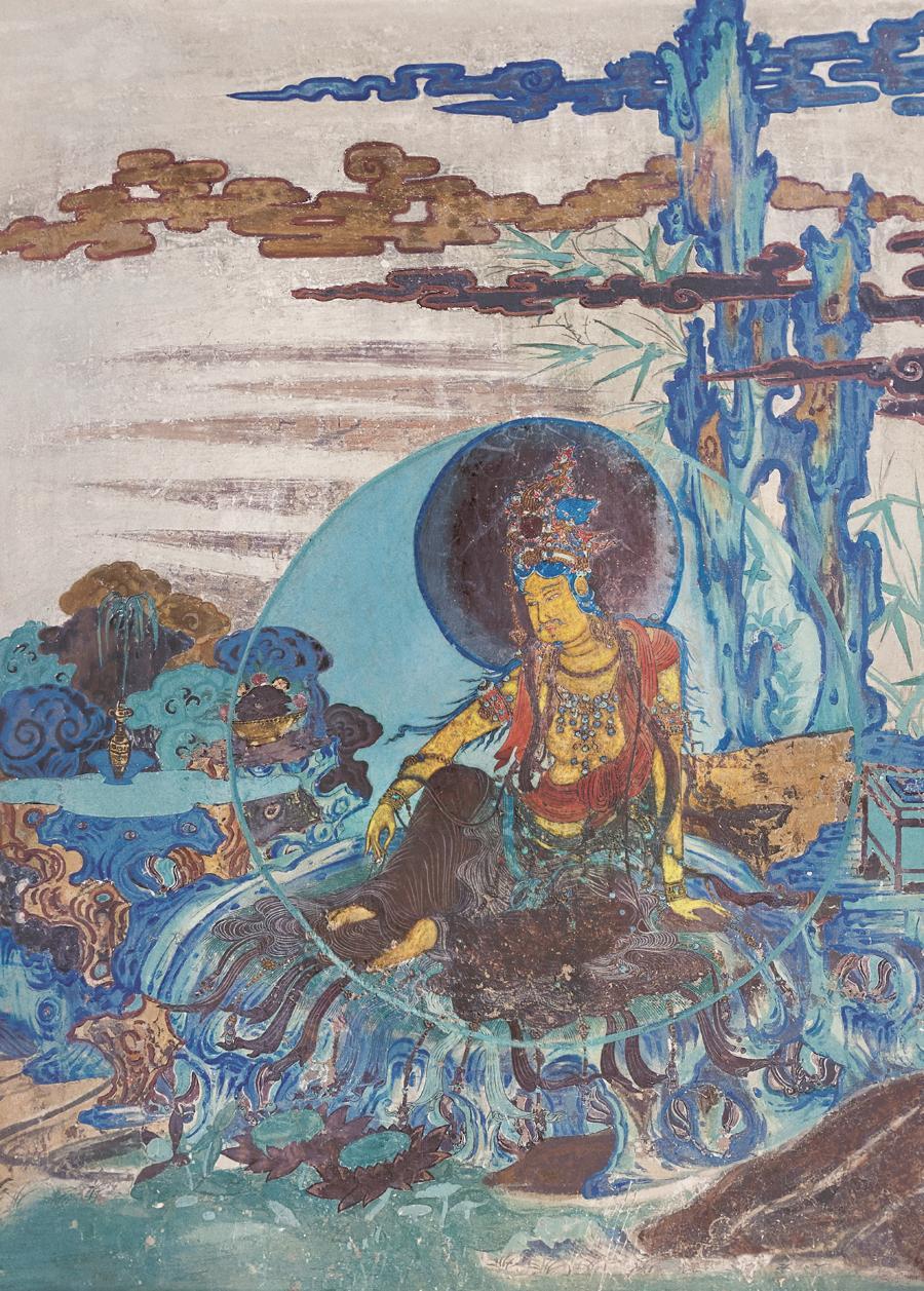 榆林窟第2窟水月觀音:石綠色的大光圈環繞菩薩,此爲身光,亦是月光,光圈的石綠設色是通透的薄色,若有若無,若實若虛,如月之虛白映入水中,一下子就把“水中月”的意象造出來了。