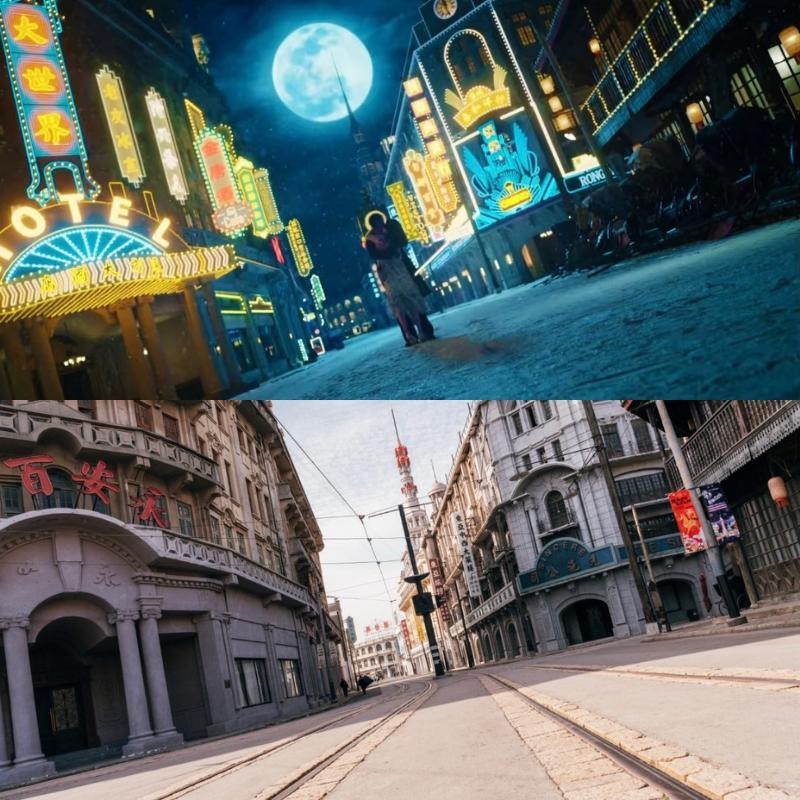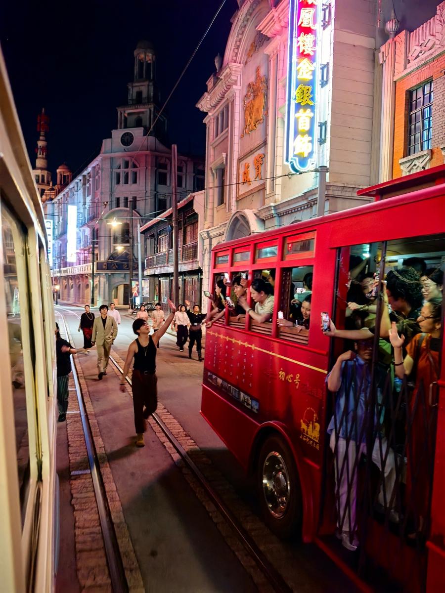 “劇中女主角觸發的‘凶宅副本’,就是我們這裏情報局的演出場地;男主角遇襲後出現藍色蝴蝶光影的噴泉區,正是結尾大戲的發生地。”上海影視樂園總經理助理、上海上影狸想國文化發展有限公司常務副總俞嵩介紹,《軋戲》中多個劇本殺場景都對應着《新世界:破籠之宴》的真實演出區域,連飄雪街頭的鏡頭都取自莊園內復刻的上世紀30年代南京路。