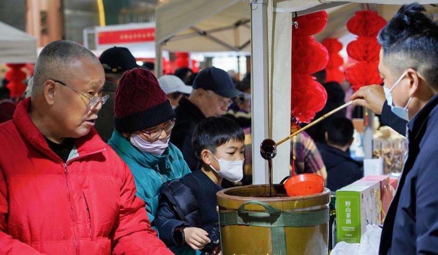 70歲的阿姨朱珍鳳和老伴手裏已拎滿年貨:風乾羊、金寨山茶油、霍邱鵝肥肝、六安瓜片……逛了半個多小時,買了500多元:“要不是手裏拿不下,非得買夠三四千元。”