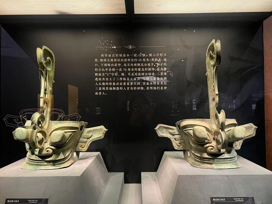 自1986年三星堆祭祀坑發掘以來,這兩件戴冠縱目面具首次同臺亮相(李揚/攝)