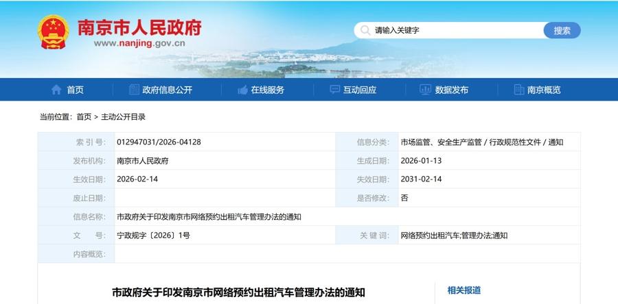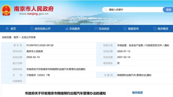日前,南京市人民政府官網發佈通知,公開發布《南京市網絡預約出租汽車管理辦法》。