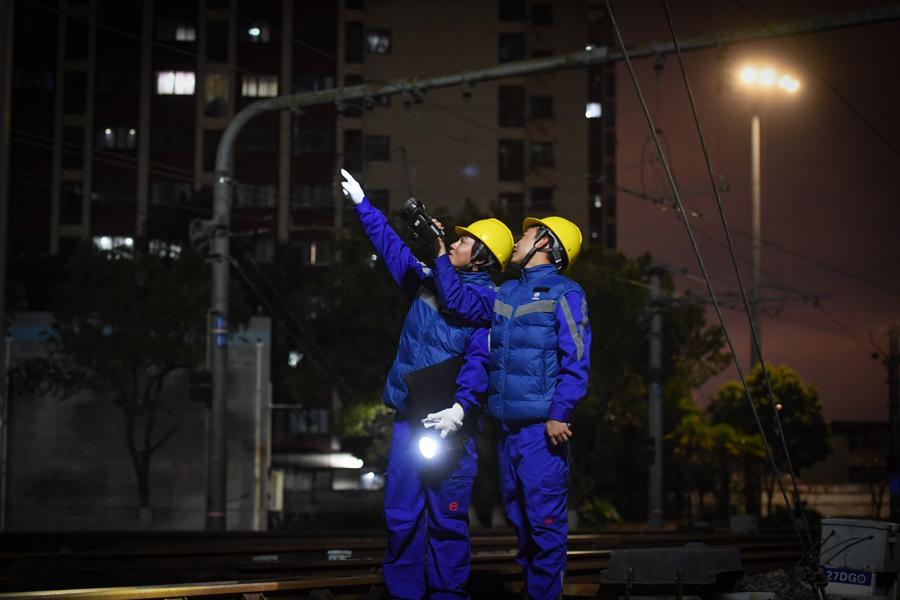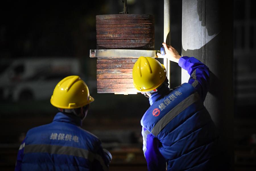 地鐵維保供電觸網運維人員正在檢查下錨補償裝置,保障列車受電順暢。