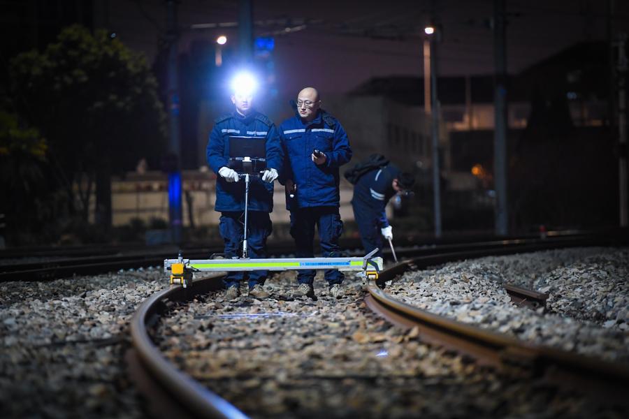 地鐵維保工務專業人員正在使用軌檢儀檢查軌道平順性。