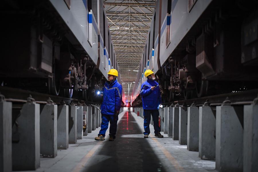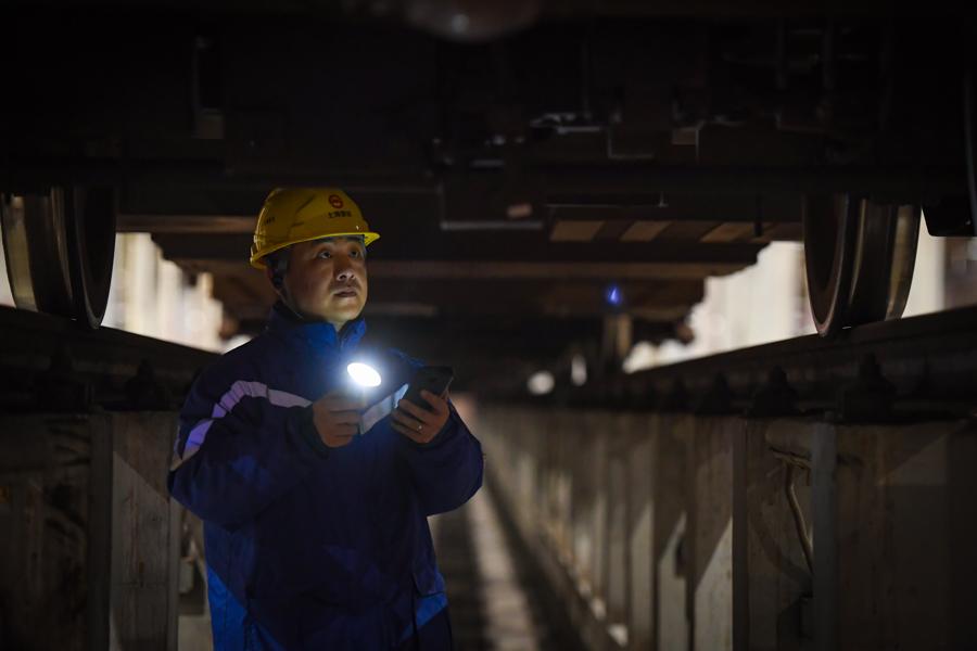 地鐵維保車輛專業人員正在進行車輛車底檢修。
