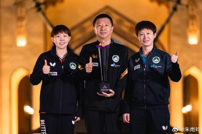 新年連奪兩冠後,朱雨玲曬出與教練陳振江、陪練金惠美的合影(朱雨玲微博)