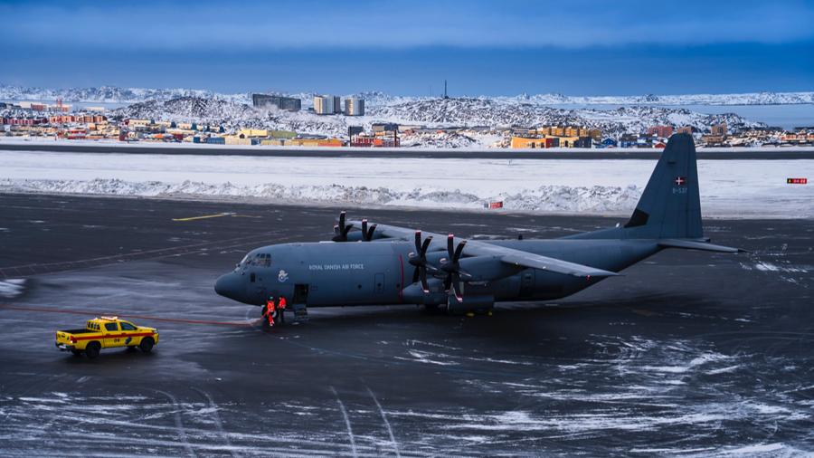 這是1月15日在丹麥自治領地格陵蘭島首府努克機場拍攝的一架丹麥空軍“超級大力神”運輸機。 新華社發
