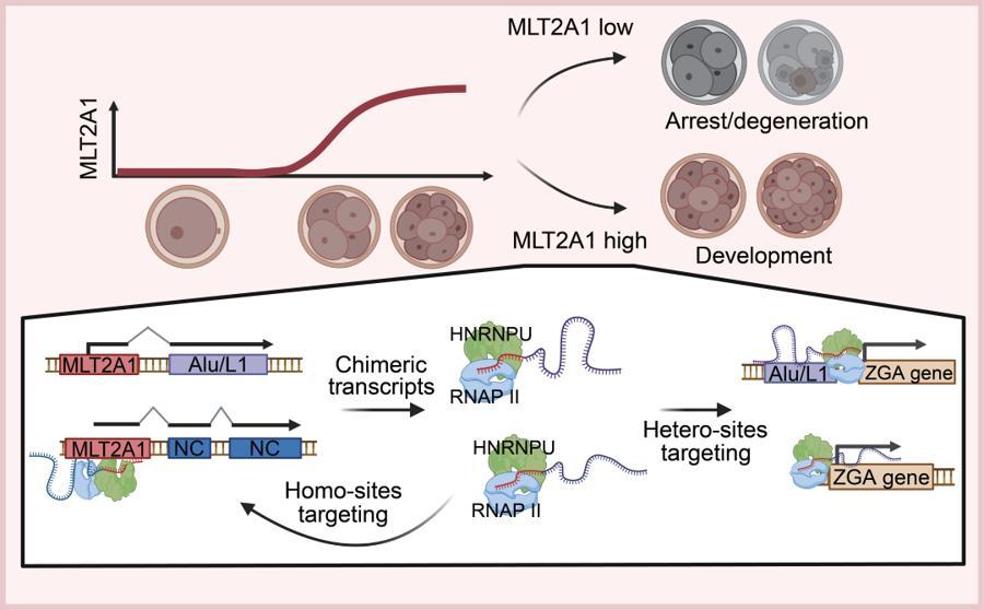 MLT2A1 亞家族逆轉座子調控胚胎合子基因組激活的示意圖