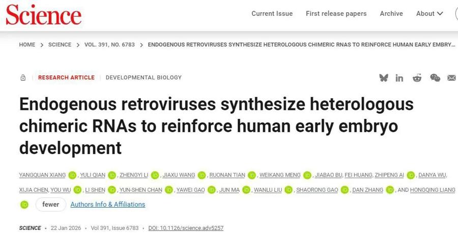 北京時間1月23日,浙江大學基礎醫學院/浙江大學醫學院附屬婦產科醫院研究員、長聘副教授梁洪青,浙江大學醫學院附屬婦產科醫院主任醫師、教授張丹,聯合同濟大學高紹榮院士以及浙江大學愛丁堡大學聯合學院長聘副教授劉琬璐團隊在國際頂尖期刊《科學》發表文章,首次揭示了人類基因組裏“遠古病毒化石”(內源性逆轉錄病毒,ERV),通過合成特殊的“嵌合RNA”,幫助人類早期胚胎順利跨越合子基因組激活(ZGA)關鍵發育節點。該研究不僅深化了對生命起源的理解,也爲改善輔助生殖技術提供了新思路。