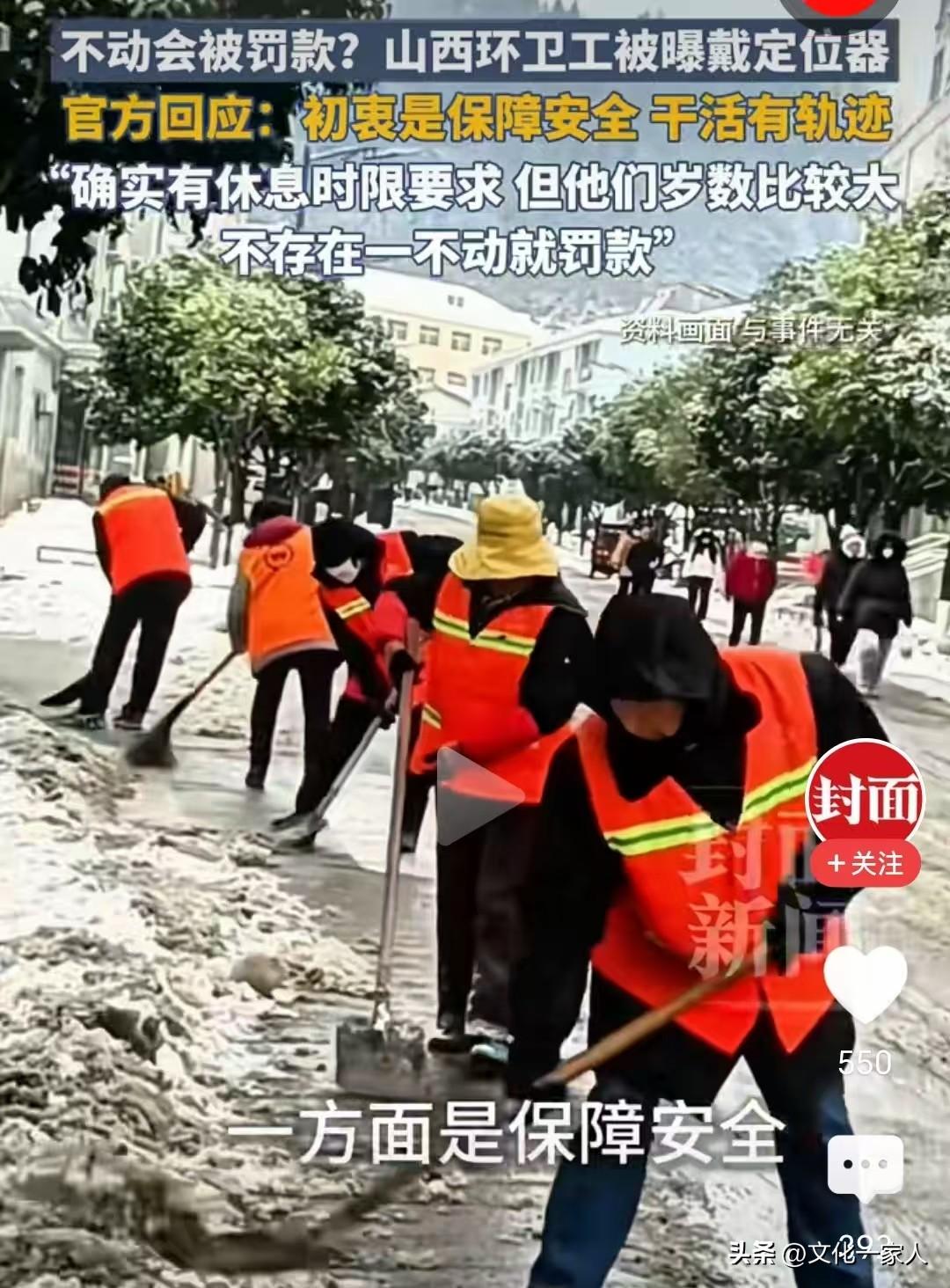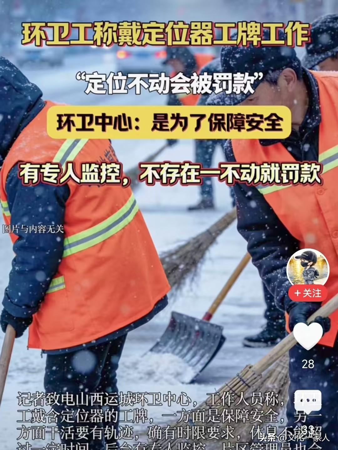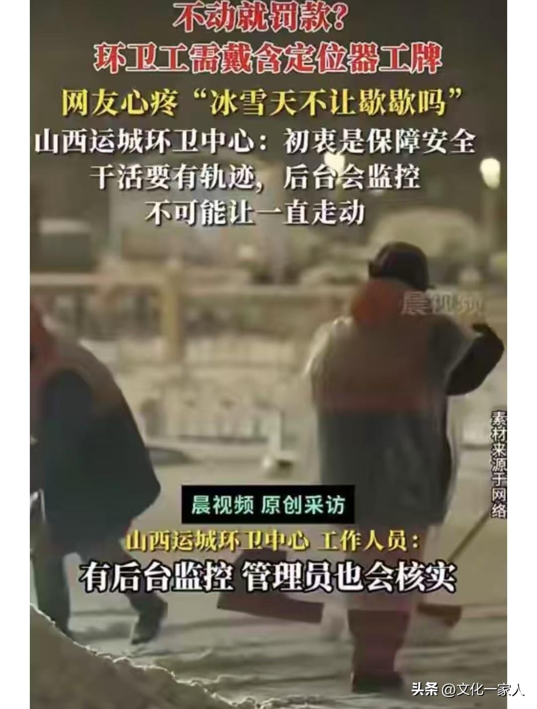山西運城給環衛工戴上定位囂(智能工牌),頂雪冒雪的環衛工只要在一地停留超過規定時間,工牌就會自動報警,後臺專門有人監視,超過時長要罰款。